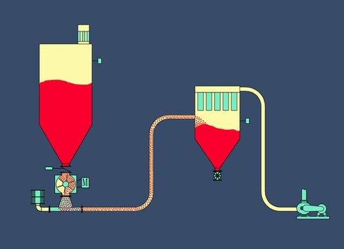 白炭黑密相氣力輸送系統主要由空壓機組、儲氣罐、緩沖斗、發送罐、管道氣體注入器、輸送和氣體管道、除塵裝置、儲料倉及邏輯編程控制器(PLC)組成。白炭黑密相輸送工藝流程。來自上游儲料倉的白炭黑通過重力卸料到發送罐,材料進滿發送罐后,對發送罐進行充氣加壓;發送罐內物料在壓縮的管道氣體注人器注人的壓縮空氣的作用下,緩慢流向輸送目的地緩沖斗;物料被輸送進人緩沖斗,含塵氣體進入到倉頂除塵器,過濾排出。白炭黑輸送是單發送罐密相輸送,是批量輸送。通過空氣緩慢流入輸送管,輸送管內的材料被配置在管內壓力和沿途配置的對應輸送管上。